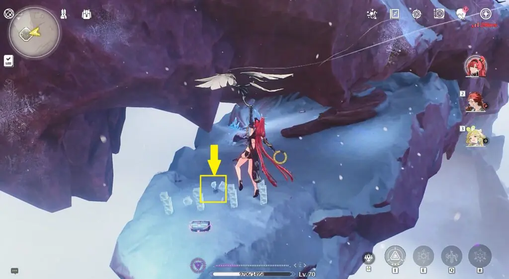 Jump down from the edge of the cliff at the location shown in the picture below and you will find the Clang Bang Echo Challenge at the ground below as shown in the second picture below. Interact with the ice to start the challenge.