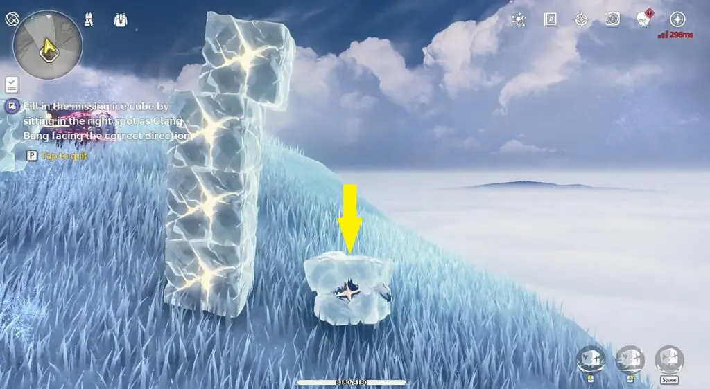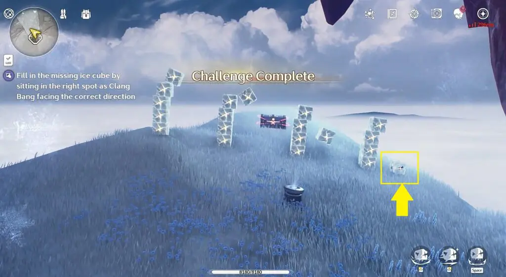 To complete the challenge, you need to fill in the missing ice cube by sitting in the right spot as clang bang facing the correct direction. Stand on the right side facing north as shown in the pictures below to complete the challenge.