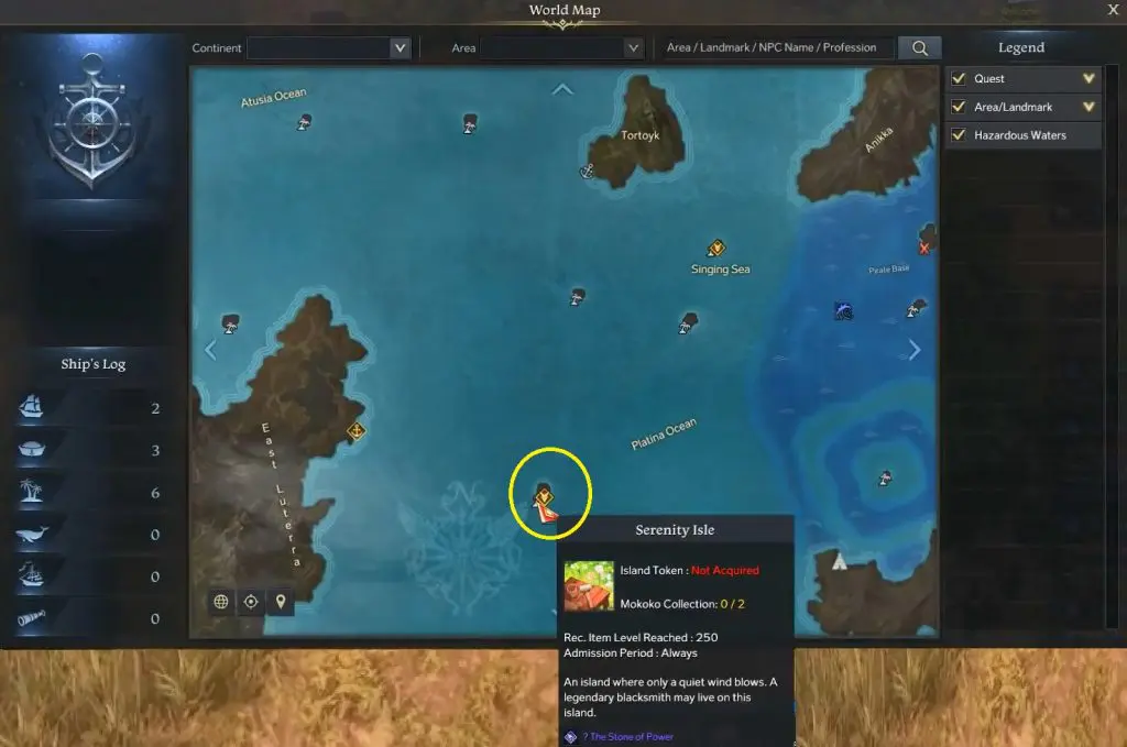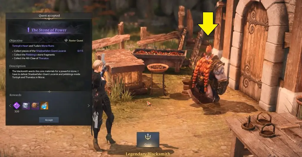 To start the quest “The Stone of Power”, players need to speak with a Legendary Blacksmith (NPC) at Serenity Isle. This NPC needs you to bring them several items so that he can use them to craft a powerful object. These items are 15 x Pieces of the Shadowfallen Giant Locarok, The Pebbling’s stone fragments, and The 4th Claw of Thanatos. Here you need to defeat Shadowfallen Giant Locarok and pebblings inside Tortoyk and Thanatos in Morai.