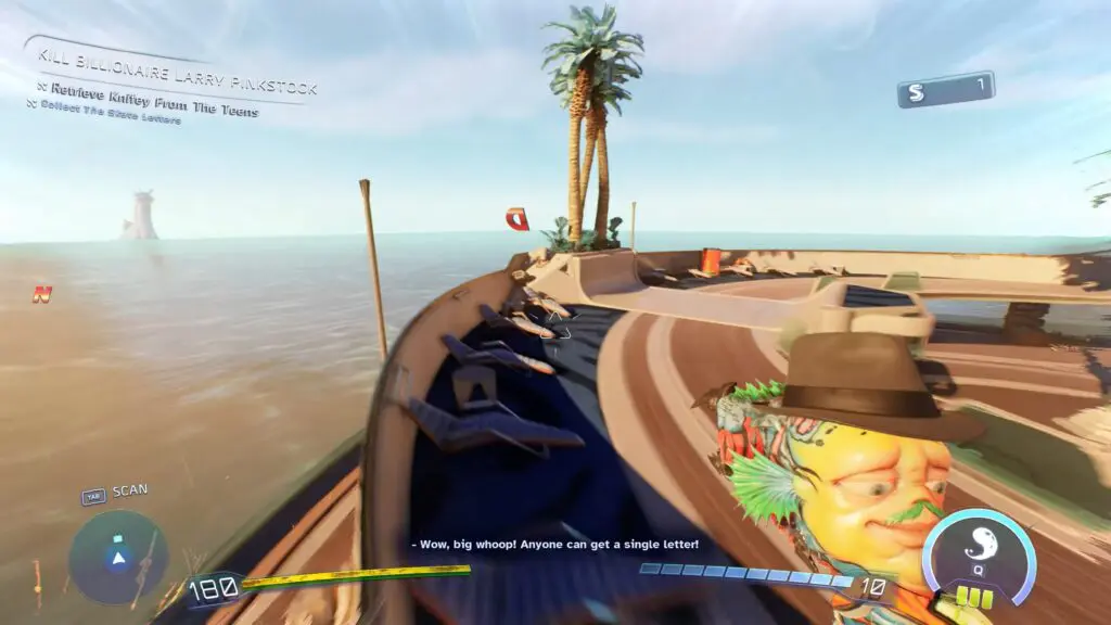 As you move forward in the quest, you will reach the Lido Deck. Speak with the kid on the deck to help free Knifey. The kid asks you to collect nearby letters using your skateboard. You must gather the letters G, O, A, N, D, S. You can pick them up in any order.