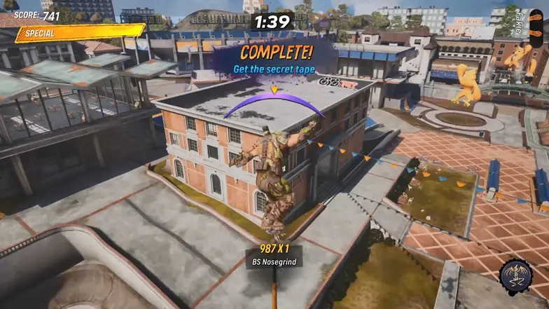 The hidden deck is located on the rooftop of the building on the left side of the area. Use the quarter pipe against the building’s wall to reach the second floor, then continue up to the third floor.