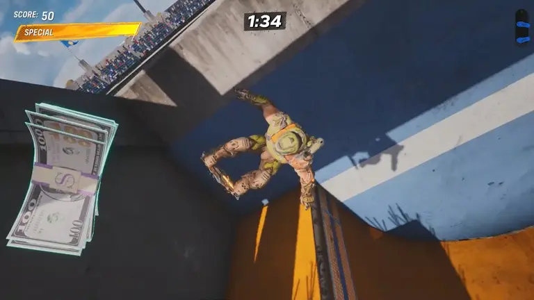 From the starting location, head to your right and enter the stadium. Follow the path to the left. At the end, use the quarter pipe to launch upward and grab the cash.