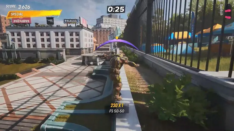 From the start of the level, there are four banners on both sides of the college gate. You need to go to the right side and jump to get to the top of the wall. Grind the wall on both sides of the gate to remove four banners.