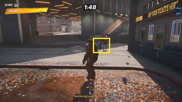 From the starting location, turn around to find a set of blue protective shades in front of a shop. Use the ramp to launch onto it, and then jump over to the balcony. Go through the balcony to find two blue barrels near the frat member. Knock down these barrels.