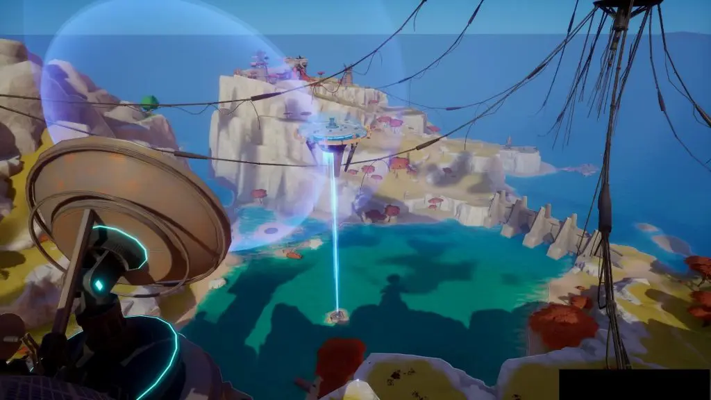 On activating the third Signal Tower, a cutscene will start in which you can see a blue beam hitting a bottom platform as shown in the picture below. Go to the bottom platform where the blue beam is hitting, and interact with it to enter the ecological park. Get the Colossus Arm there from a special supply pod as shown in the second picture below.