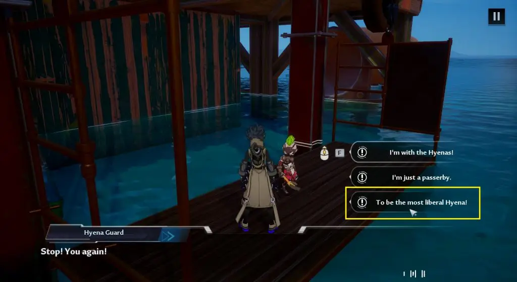 Now you will need to complete the “Hyenas Banges Base” side quest. You get this quest by talking to the Hyena Guard on the small rig west of the Banges mainland as shown in the picture below. When talking to the guard, always select the first dialogue option to get the quest.