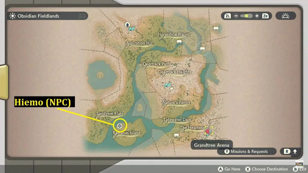 To start the request no. 51 – Coming Up Roses, Head out to Ramanas Island in the southwest of Obsidian Fieldlands and speak with Hiemo (NPC). I have marked his location below. He will ask you to bring them “a Pokemon with a scythe on each arm.” Here the Pokemon Hiemo is referring to is Scyther.