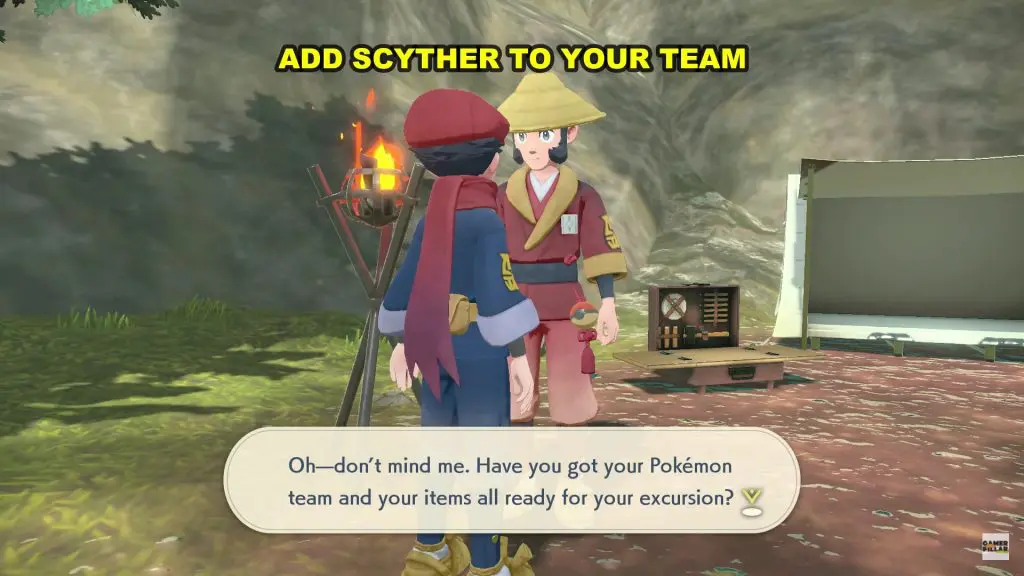 After catching Scyther, head to the nearest camp and add Scyther to your party. Once Scyther is on your team, head back to Heimo.