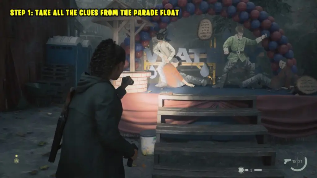 To fully investigate the Parade Float for evidence, the player needs to find a “Moose Skull”.