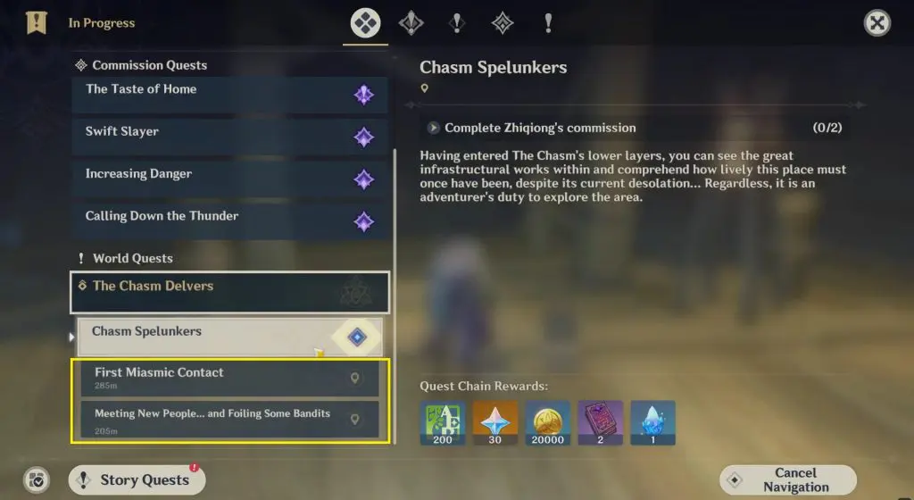 This guide shows how to complete the “Complete Zhiqiong’s commission” objective for the Chasm Spelunkers world quest in Genshin Impact 2.6, which released on 30th March 2022. To complete this objective, you will need to complete two world quests: First Miasmic Contact and Meeting New People and Foiling Some Bandits.