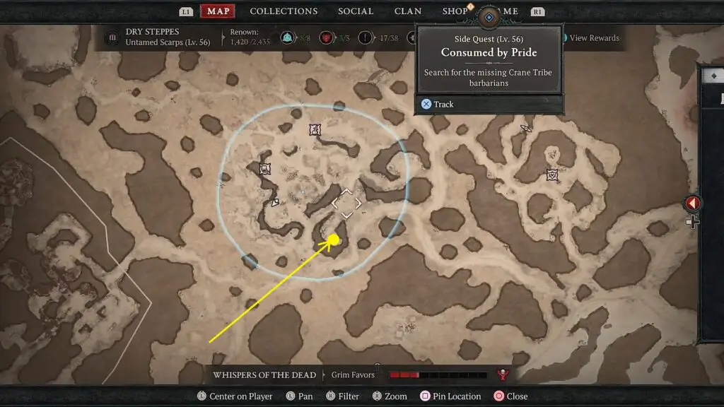 This guide shows the complete walkthrough of the Consumed by Pride side quest in the Diablo 4 game, released on 6th June 2023. You get the quest by talking to Ealda in the Untamed Scarps area in the Dry Steppes region as shown in the pictures below.