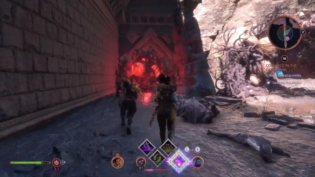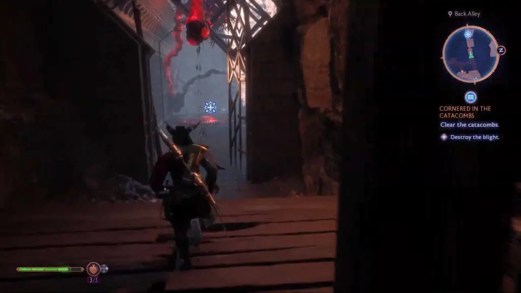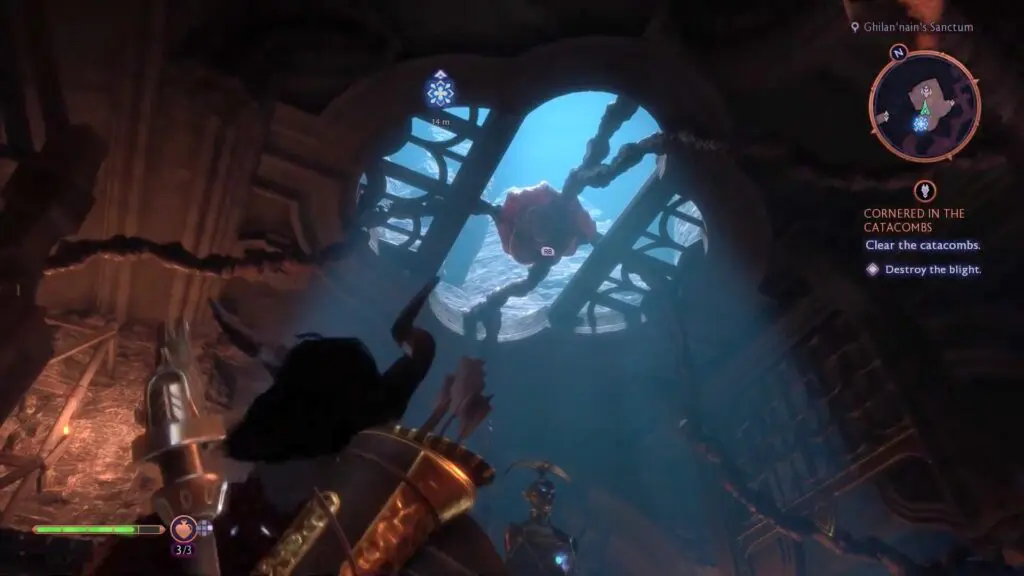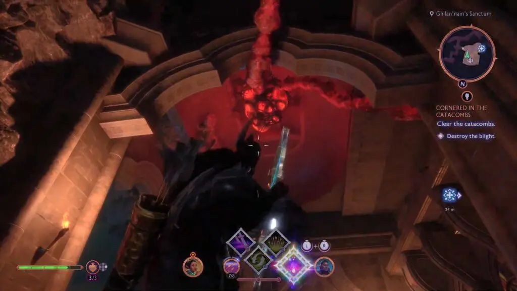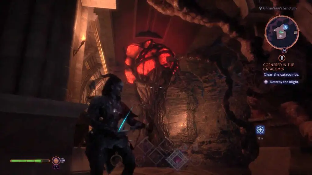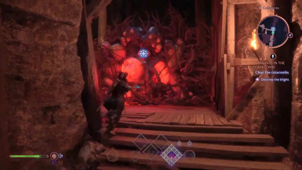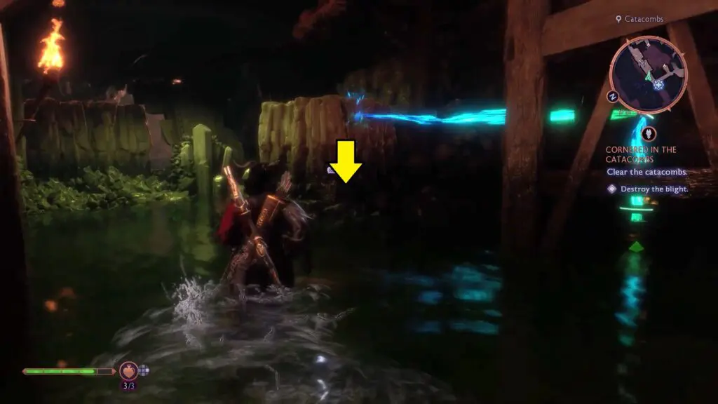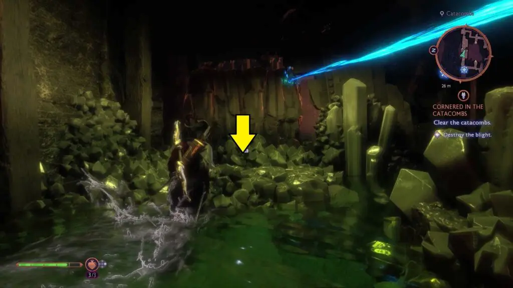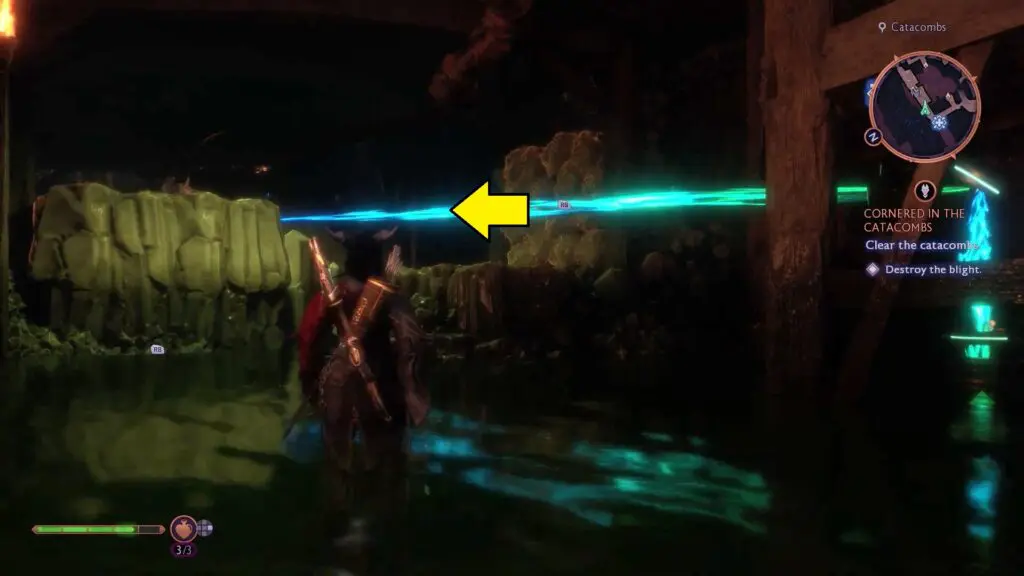 As the quest starts, head inside the Catacombs to reach a large room full of Blights. First, head toward the in-game marker and shoot the Blight in the middle of the room.