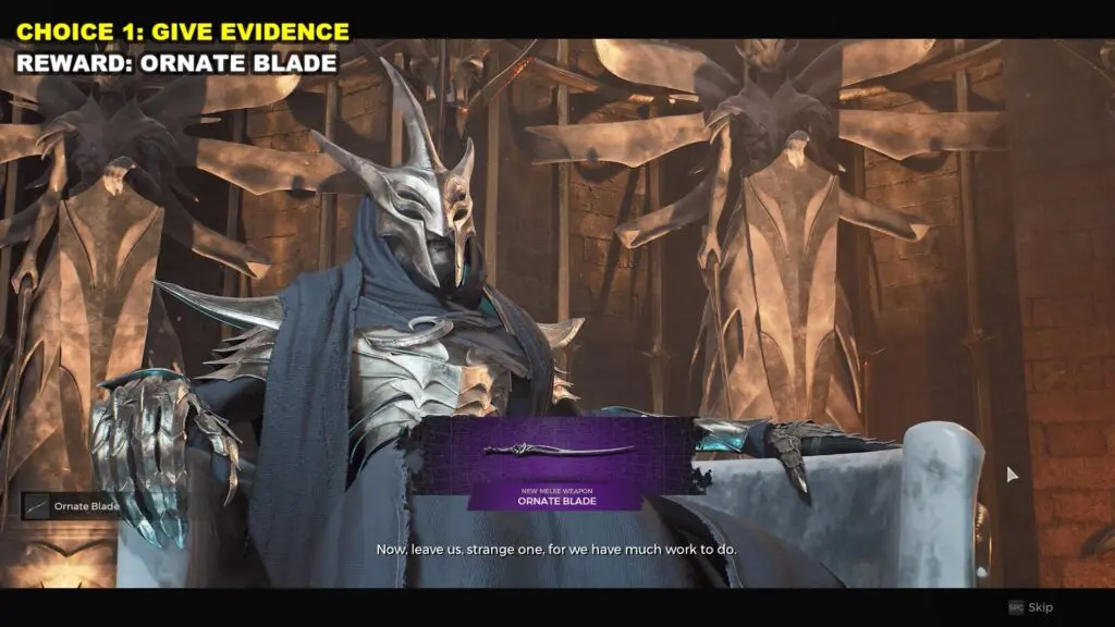 Provide your evidence to the council and earn the Ornate Blade which is a melee weapon.