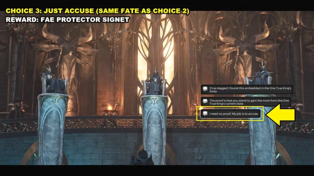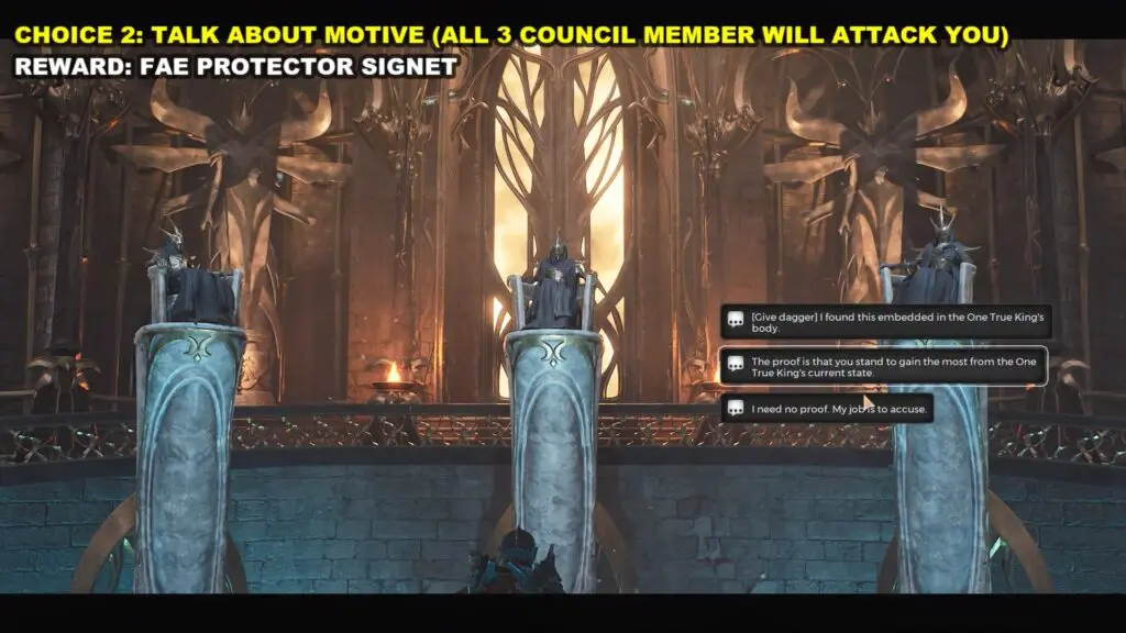 If you select the third option then all three council members will also attack you. Defeat them to also earn Fae Protector Signet.
