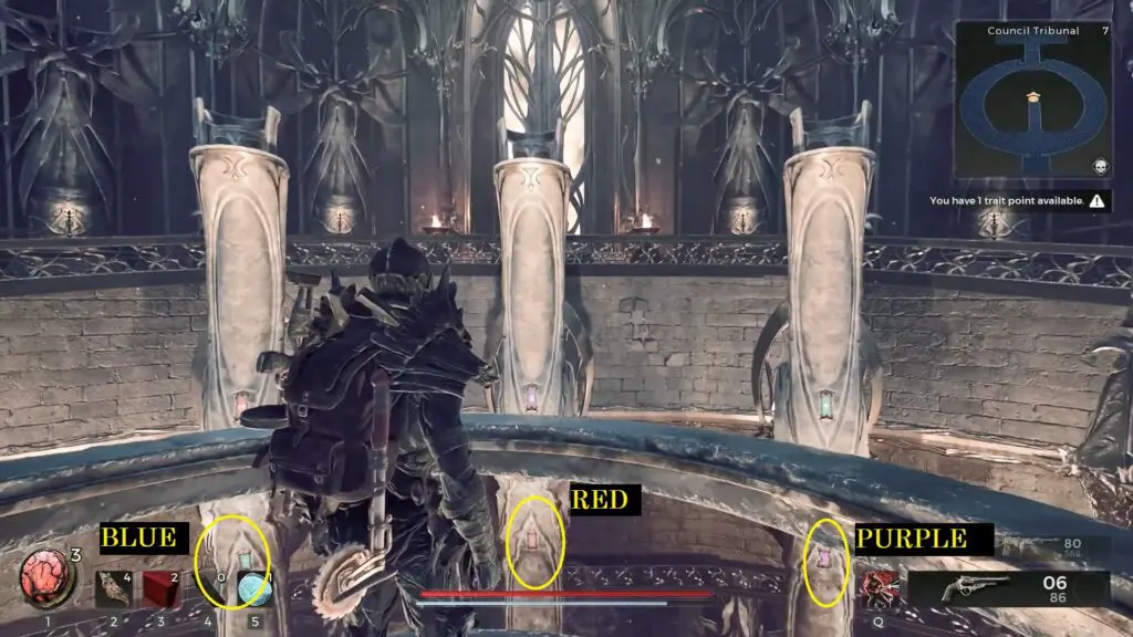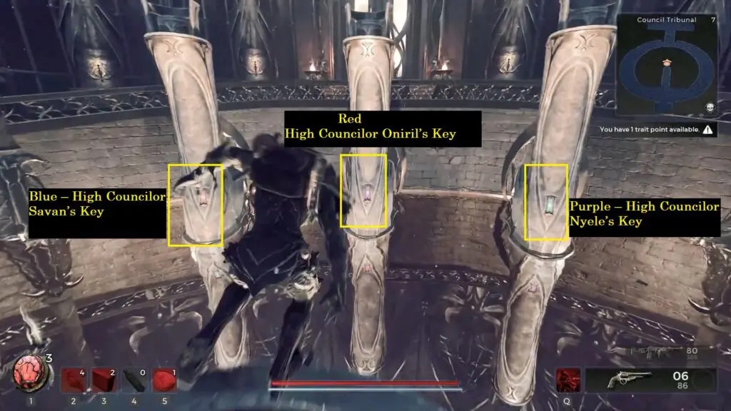 In the Council Tribunal, each of the three high councilors’ chairs has a rectangular key with a distinctive symbol and color. These keys are arranged incorrectly. You can interact with the chairs to remove the keys and add them to your inventory.