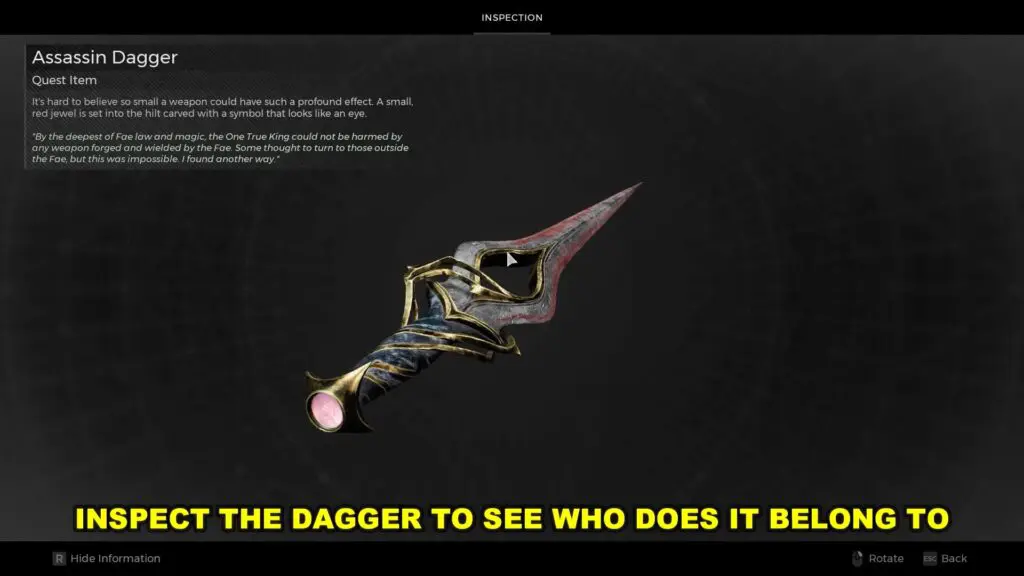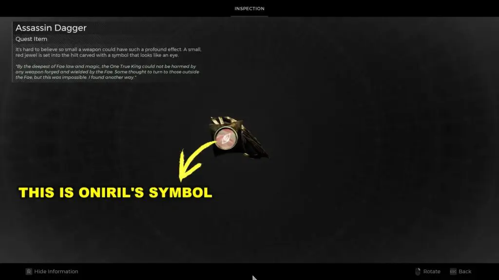 Access your inventory and find the Assassin’s Dagger. Examine its symbol carefully, recalling the symbol you observed on the pillars in the Council Tribunal. The symbol in the Assassin’s Dagger is related to Oniril’s Symbol.