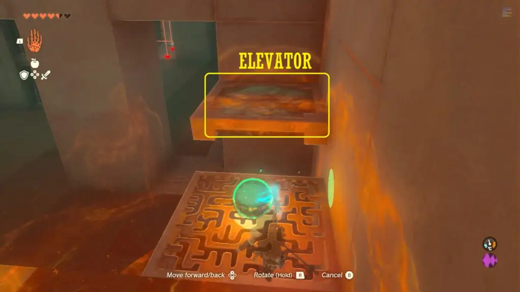 Use ultrahand ability to take the ball to the upper floor using the elevator near the wall.