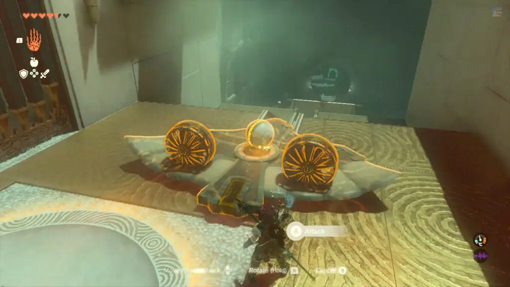 Inside you will find a Glider. Set the Glider on the rails leading off the platform and place the ball on it also. Strike the fans of the glider to carry the ball to the starting location of the shrine.