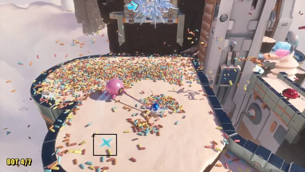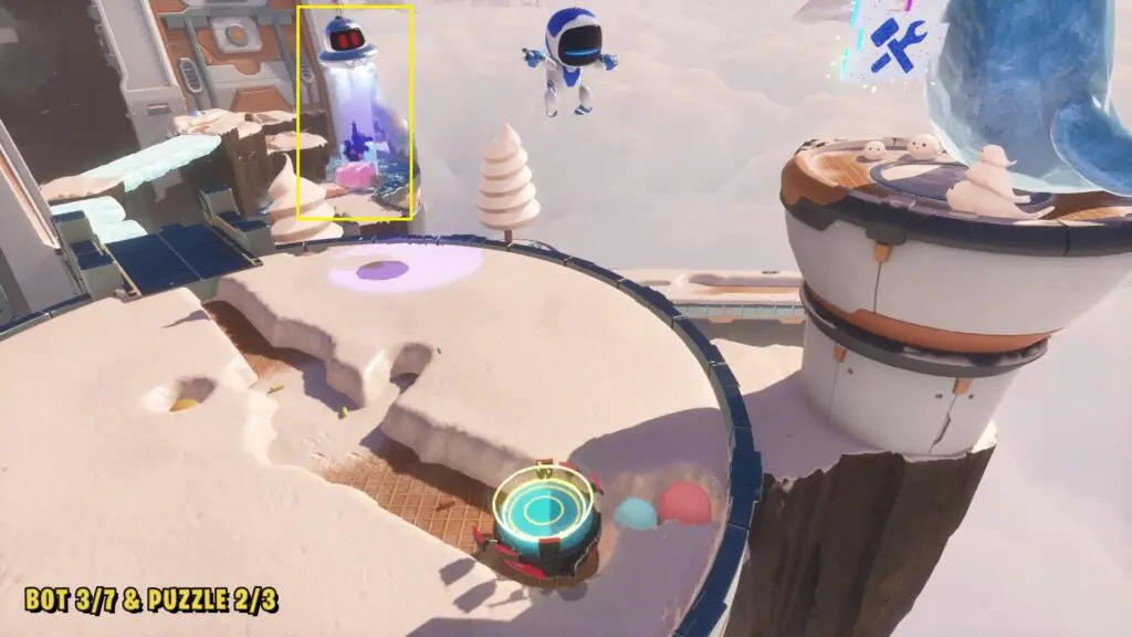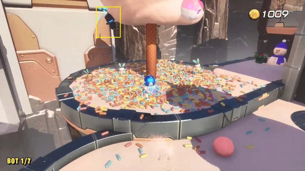The first bot in the Creamy Canyon level is available at the start of the chapter. Follow the path and look for a white ice cream tree on the left. Hit the tree to make the bot will fall.