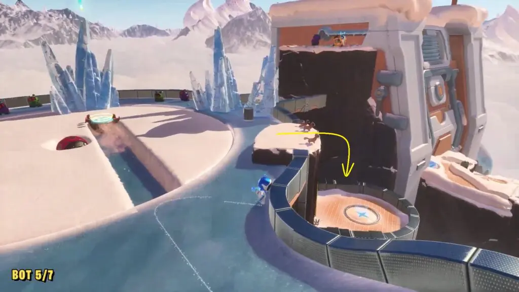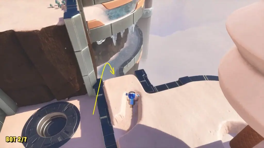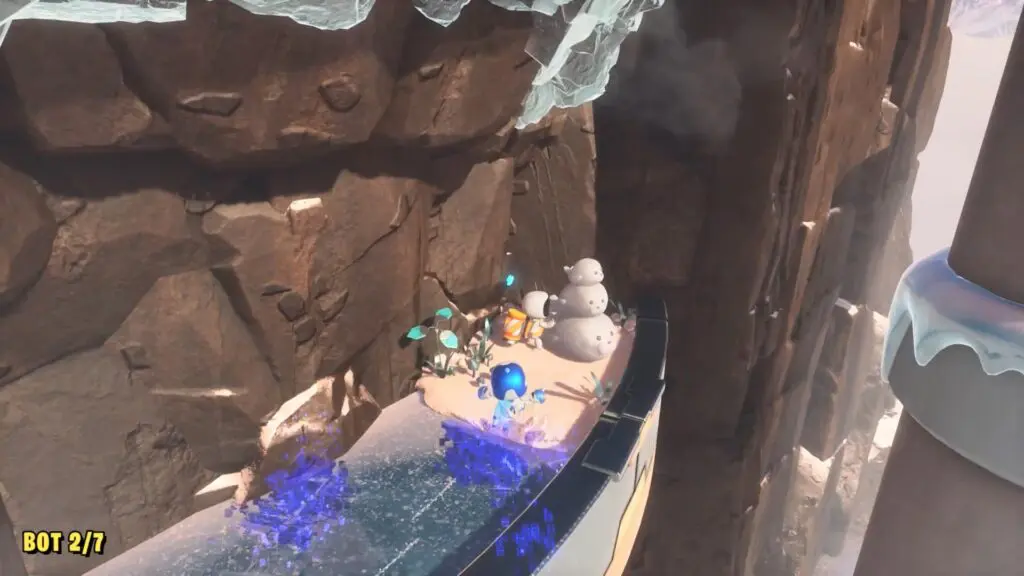 Keep moving forward while dodging the falling ice, and you’ll find a bot building a snowman at the end.