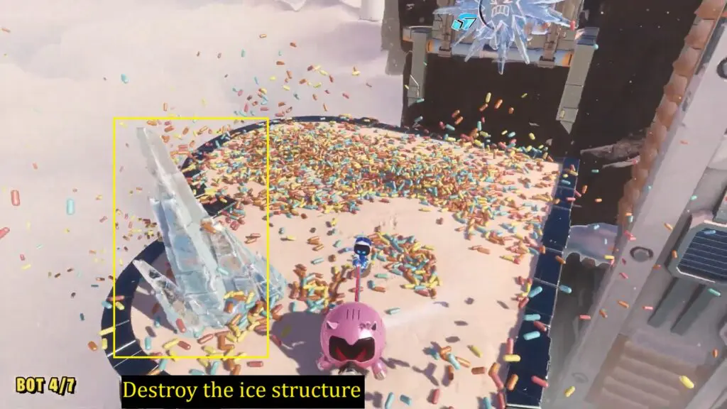 Hit the ladybug again to destroy all the ice structures ahead and find a bot.