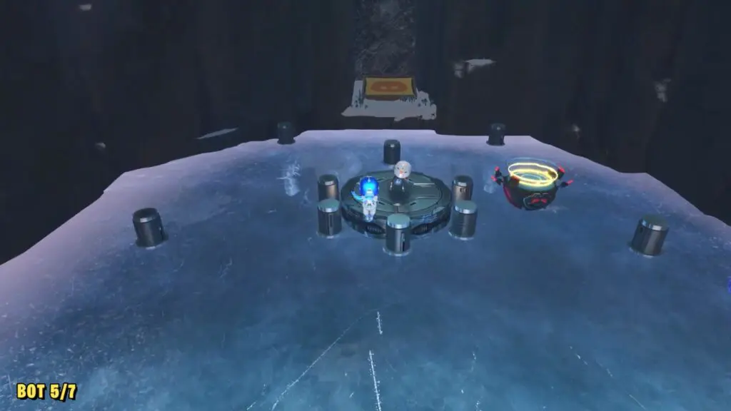 You’ll see a bot hanging from a UFO. Follow the path as the UFO reaches a round platform area where the UFO moves in a circular pattern.