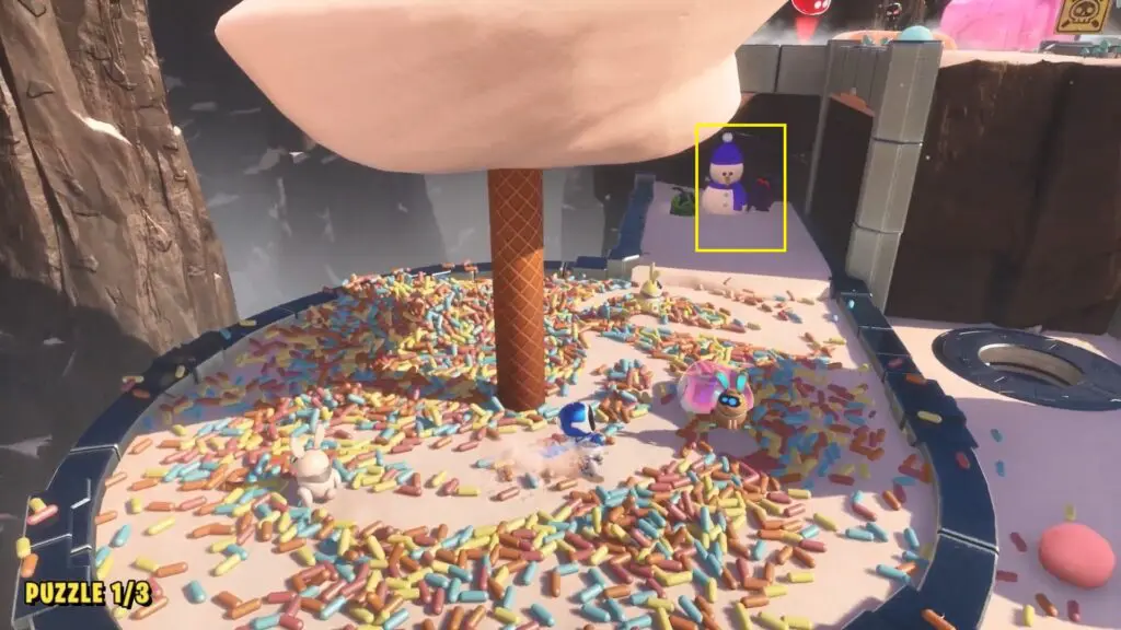 The first Puzzle Piece in the Creamy Canyon level is available at the start of the chapter. Follow the path and look for a white ice cream tree on the left. Go straight on the small path behind the white ice cream tree to find a snowman. Destroy the snowman and pull the wire to reveal the Puzzle Piece.