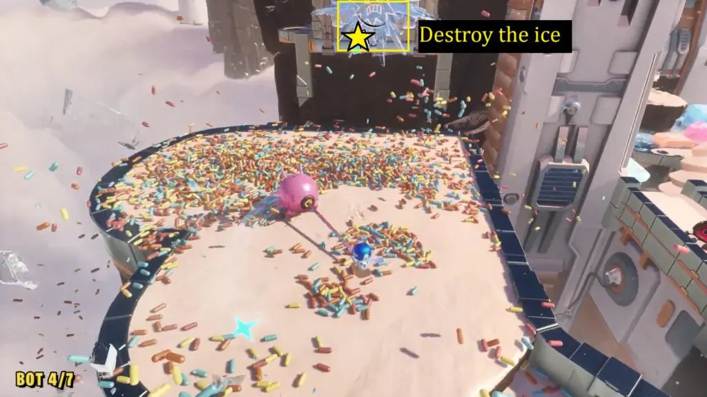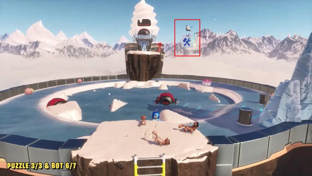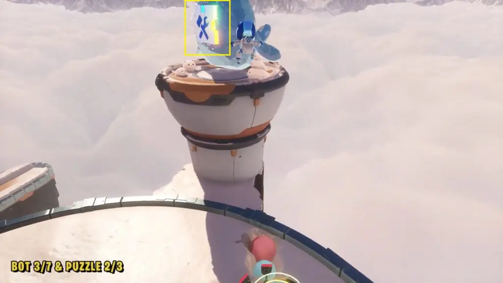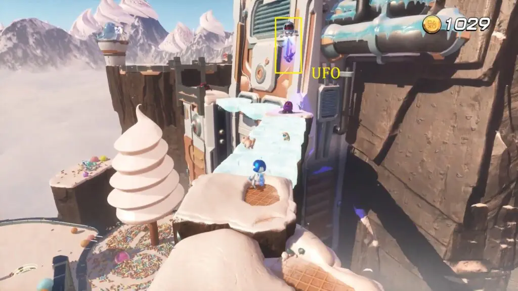 You’ll see a bot hanging from a UFO. Follow the path as the UFO reaches a round platform area where the UFO moves in a circular pattern.