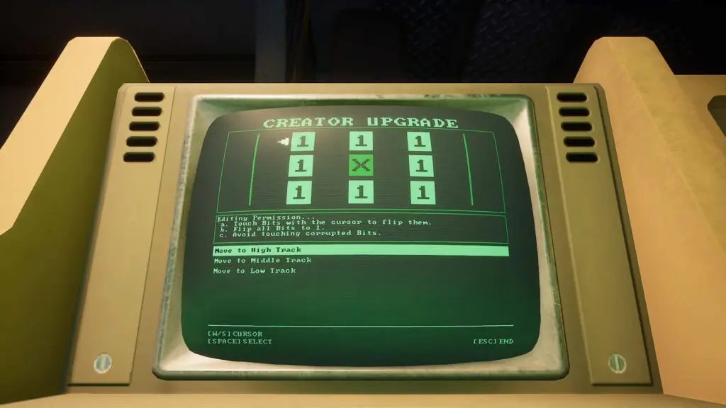 Insert your Data Diver into the machine and start the upgrade. This will trigger a small puzzle where you’ll see a 3×3 grid on the screen, with each tile showing either a 0 or a 1.