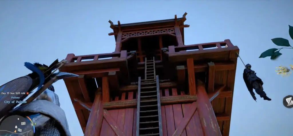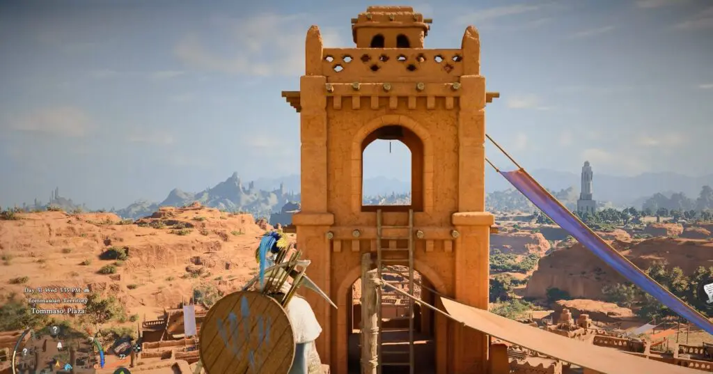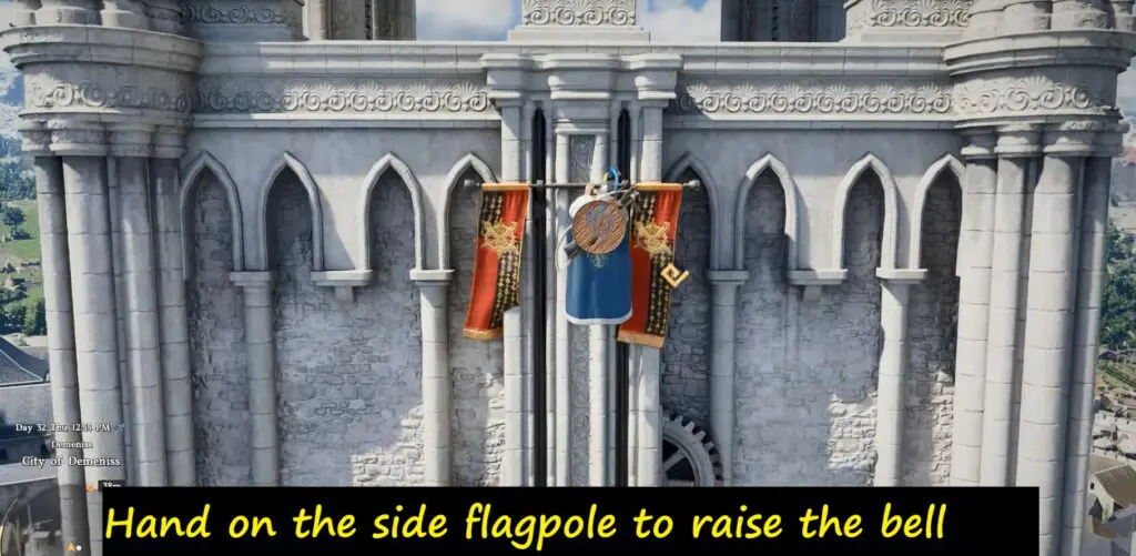 Go to the biggest city in the center of Demeniss to find this bell on the tallest clock tower. Climb on the wall of the tower until you reach a side flagpole. Hang on to it to raise the bell, then go to the top of the tower and ring it.
