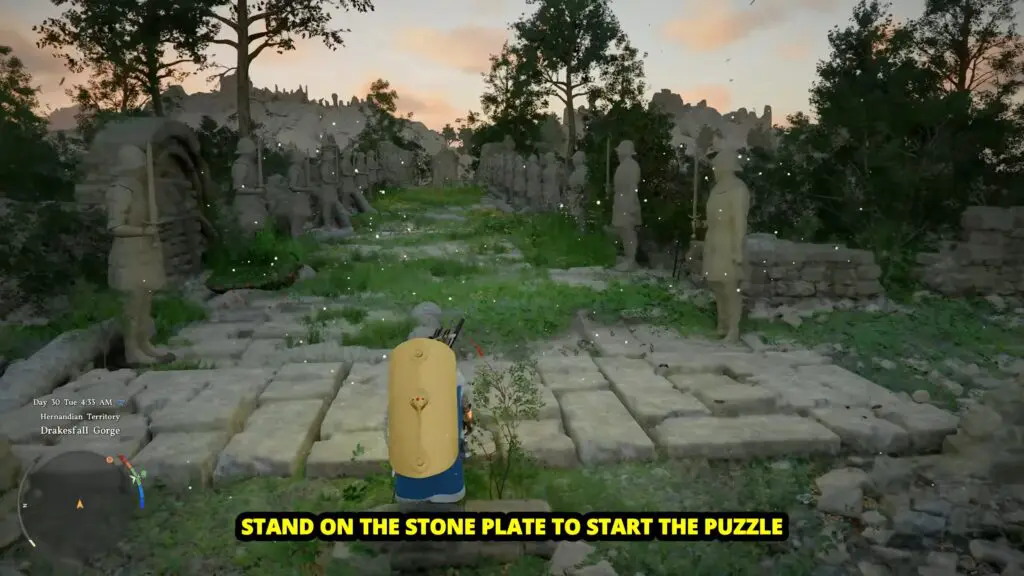 Once you reach the puzzle area, you will notice two straight rows of stone statues lined up on both sides of a narrow path, with a large King statue standing at the far end in the center. At the start of the path, there is a stone platform. Step onto this platform to begin the puzzle. As soon as the minigame starts, the statues on both sides will lift their swords.