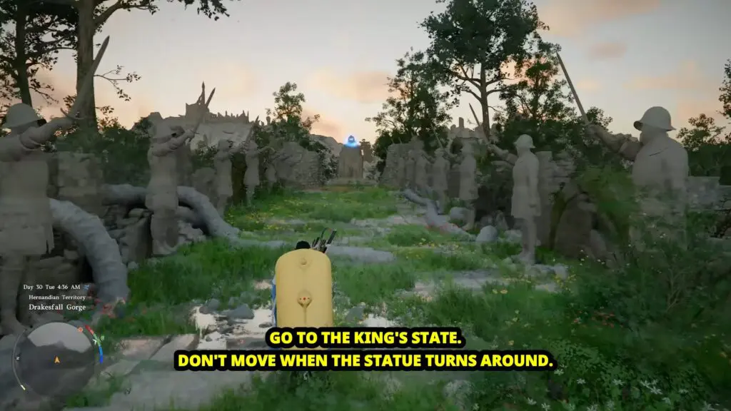 As you progress, stay focused on the statue’s head movement. Move forward step by step, pausing whenever the head turns toward you, and continue this pattern until you get close to the King statue.