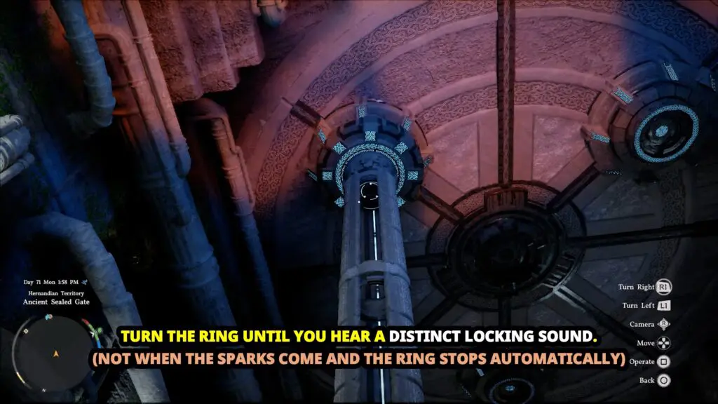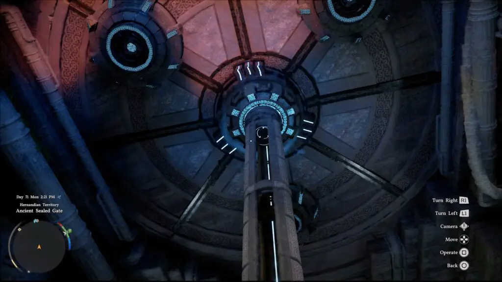 Once all three gears are locked into the right positions, the middle gear will light up and drop down from the ceiling. Move the pillar to the center of the room and interact with the middle gear.