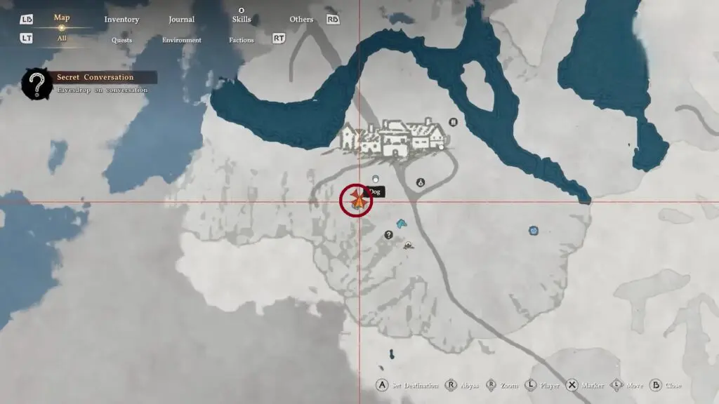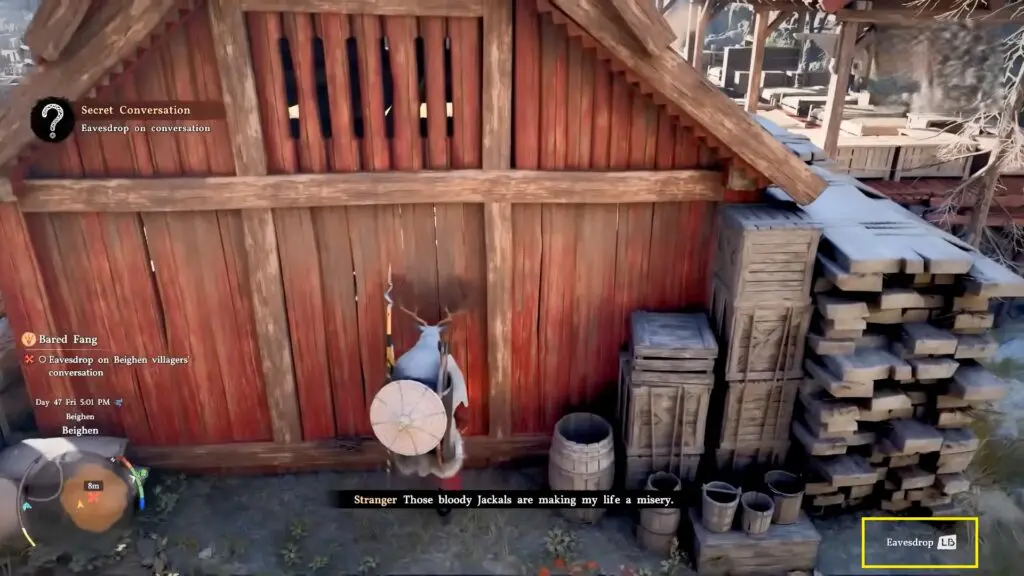 You’ll now get a new quest marker. Follow it to another location in Beighen and eavesdrop again. This second conversation gives you a key clue about a mysterious faction. You need to enter the building and stand near the far end wall to start the eavesdrop.