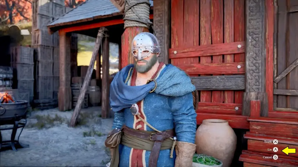 After gathering the first clue, go to the nearby guard and start a conversation. During this interaction, you will get a choice between telling the truth or a lie.