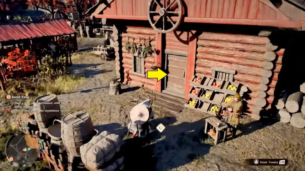 For the last part, head behind a nearby building. The exact spot should be marked on your mini-map if the quest is active. Go behind the building and stand near the wall between wooden boxes and wooden slabs.