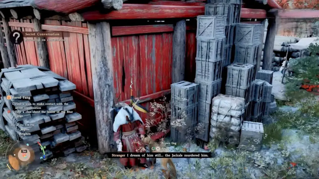 You need to stand behind the wooden wall of the building, right next to the stacked wooden slabs. This is the exact spot where the eavesdropping prompt will trigger. Refer to the image below for the correct location. Once you are in position, press L1 or LB on your controller to begin eavesdropping, which will reveal the first clue needed for the investigation.