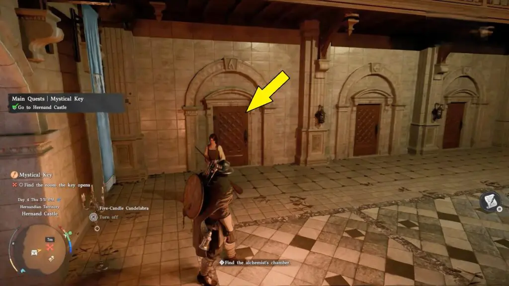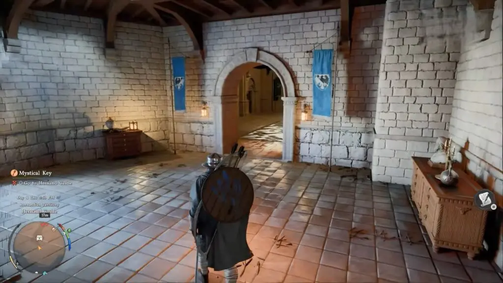 Inside the castle, follow the straight path until you reach a locked iron gate. Wait for the soldiers to open it, then head inside the main castle building. Go up the stone stairs to the second floor. Enter the first doorway on your left, where two guards are standing.