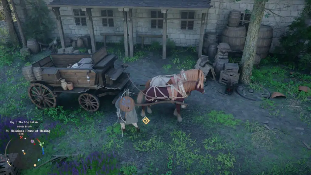 After crossing the bridge, get off your horse and move to the right side of the area. Now look carefully at the people around you. Guards wear a yellow uniform with hoods, and they are the ones you must avoid. Patients wear white, and they will not bother you. Always stay away from the guards.