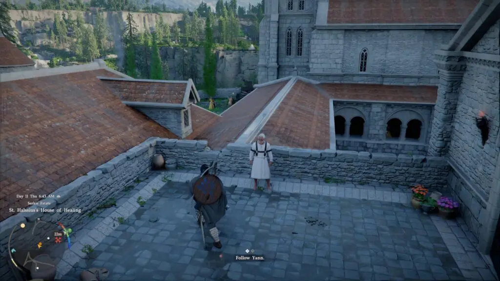 As the quest begins, head east from Hernand City toward the House of Healing. When you arrive, you will see guards at the main gate, and you cannot enter directly through the main gate. You can buy a disguise or an invitation for 10 silver each, but you do not need to spend any money. The easiest way is to sneak in using the side paths.