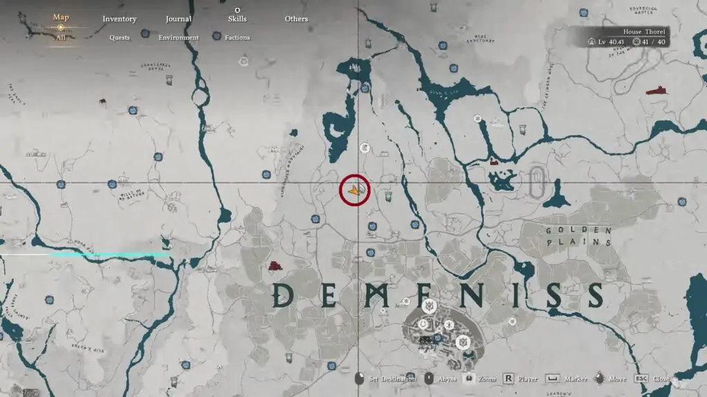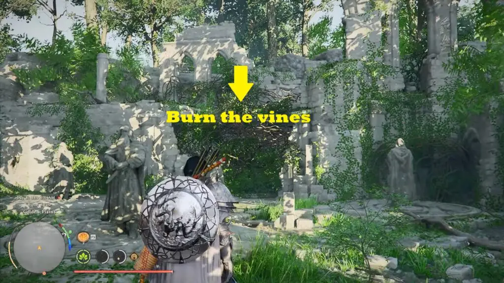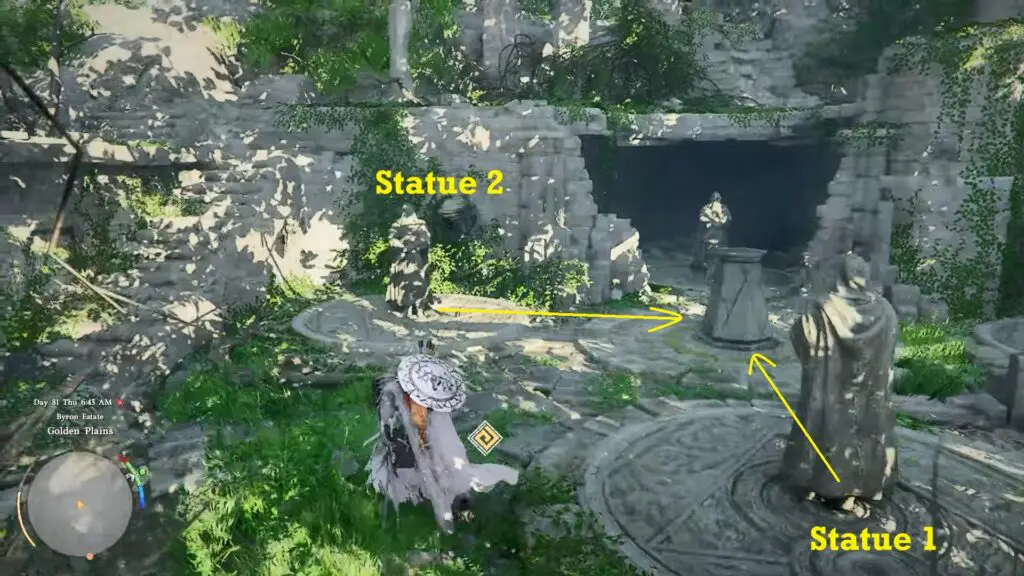 This puzzle is located just north of Demeniss in the Golden Plains area. Refer to the location below. Zoom in to spot a “Mysterious Energy” marker on your map, then head to that location to find the puzzle site. When you arrive, you’ll see statues with vines blocking part of the area.