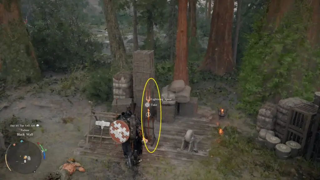 You need to clear out all the enemies in the camp before you can pick up the Lightning Spear, as the game will not let you interact with special weapons while enemies are still on alert.