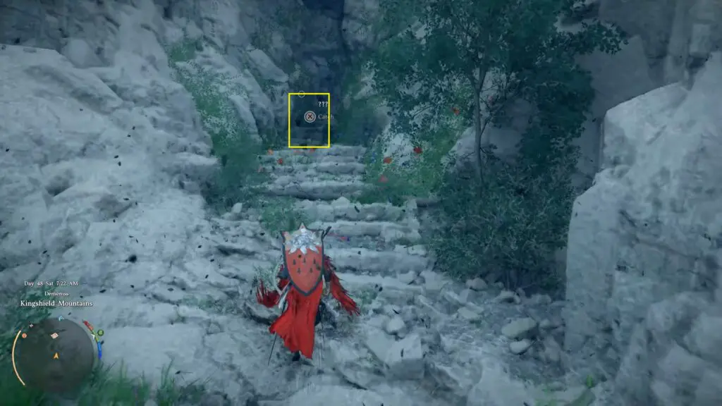 Treasure Map Piece 2 can be found at the northern base of Northernshield Mountain in Demeniss. First, open your map and go to the marked location. When you reach the area, walk along the mountain wall and look closely to find a small crack or gap in the rocks.