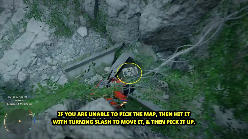 Inside this crack, you will see a stone coffin placed against the wall. Inside it, you will find a map piece. If you do not see the prompt or are unable to pick it, then use a Turning Slash attack to hit the coffin. After that, try interacting with it again, and you should be able to collect the map piece.