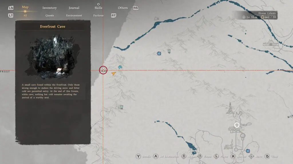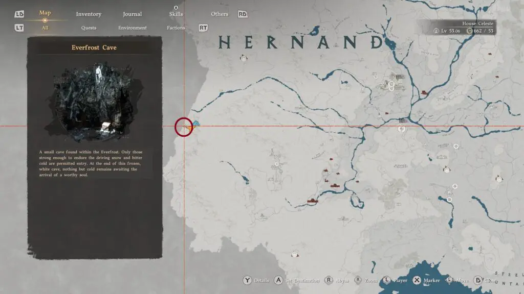 To find the treasure, head west of Hernand toward the snowy mountains. Make your way to Everfrost Cave, which is marked on your map.