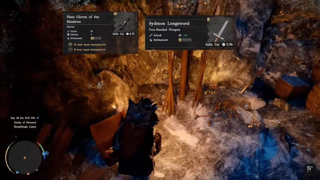 Once you enter the cave, move inside carefully until you find a treasure chest. Open the chest to receive the Sydmon Sword and Plate Gloves of the Shadow as your reward.