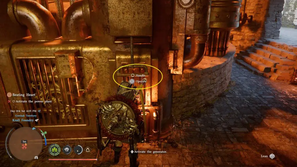 To activate the power plant, you need to interact with the machine in front of you in a specific order. The process looks complicated at first glance, but once you know what to do, it is actually pretty simple. Start by pulling down the lever on the machine. Next, look at the bottom right side of the machine, and you will spot a button with a circle symbol.