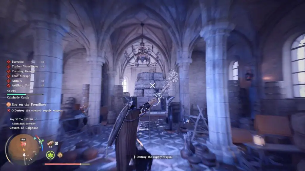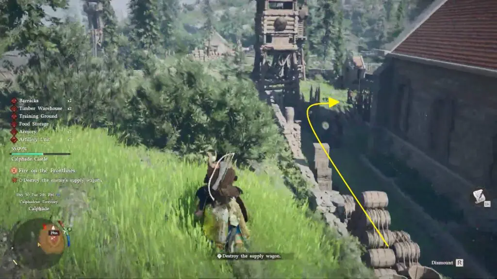 After clearing the area, head inside to the location of the supply wagon. At first glance, it may seem like you can destroy it using normal methods. You might try using fire arrows, explosive barrels, or even heavy weapons like the warhammers nearby. However, none of these will actually work, which is where the confusion usually starts.