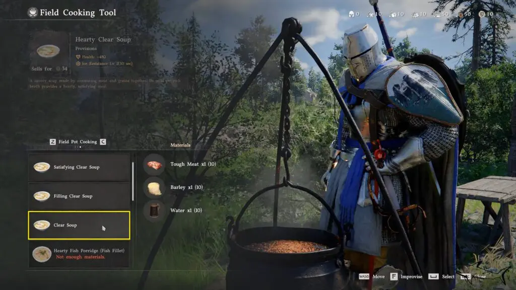 Once you have them, go to the cooking pot and press X to start cooking. In the menu, use R1 and L1 to switch to the soup section, then scroll down and select Modest Clear Soup. Press X to cook, and when prompted, choose a quantity of at least 2 to complete the objective.