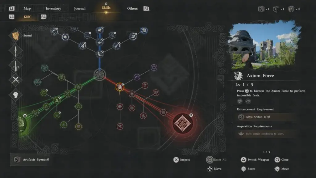 You can upgrade Axiom Force through the skill tree. Upgrading requires an Abyss Artifact, which you can collect during your adventure. You can enhance Axiom Force to improve its effectiveness.